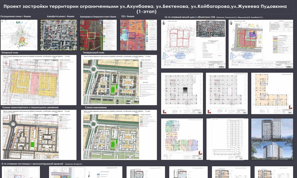 Также проектом предусматиривается комплексная застройка территории с обеспечением транспортной и пешеходной доступности, уплотнение существующей застройки. В составе проекта заказчиком Рашитов И.У. предлагается размещение 6-ти этажного административного здания с подземным автопаркингом на собственной территории по адресу ул.Ахунбаева, 68,70,72. Так же заказчиками Сеиткулов Н.А., Абдилаев Д.Ж., Аманбаев Е.У. предлагается размещение 15-16-ти этажного жилого дома с объектами СКБ и 2-х уровневым подземным автопаркингом на собственной территории по ул.Тобольская д.8/1, д.8, д.10, д.12а, ул.Койбагарова д.85. Так же заказчиком Исаевой Б. предлагается размещение 5-ти этажной гостиницы с эксплуатируемой кровлей и подземным автопаркингом на собственной территории по ул.Койбагарова, 93, пер. Предгорный, 30.