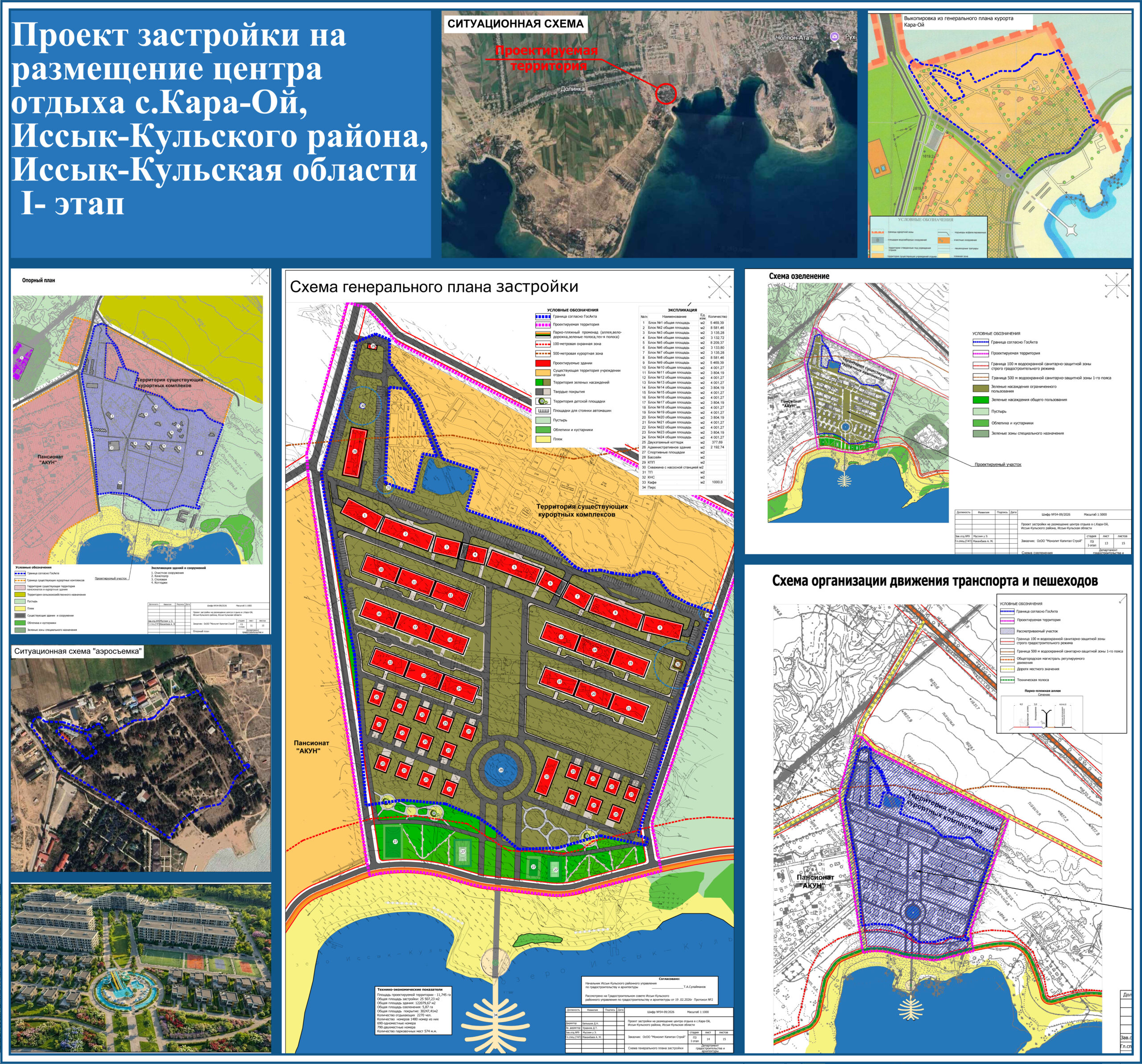 Работа выполнена Департаментом градостроительства и архитектуры на основании заявки ОсОО «Монолит Капитал Строй» за №100250886 от 24.12.2025г. и заданию на выполнение проекта застройки на размещение центра отдыха в с.Кара-Ой, Иссык-Кульского района, Иссык-Кульская области  (I-этап) согласованного с заказчиком.