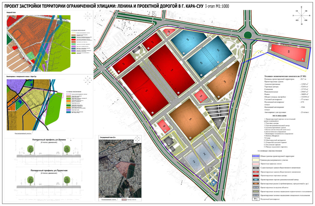 Проект застройки территории ограниченной улицами: Ленина и проектной дорогой в г. Кара-Суу, Согласно утверждённому постановлением городского кенеша г. Кара-Суу от 19.02.2014 г. генеральному плану города Кара-Суу, рассматриваемая территория относится к зоне «Территория рынка». Территория проектирования расположена в западной части г. Кара-Суу. Рассматриваемая территория используется в качестве коммерческо-торговой (рынка), сельскохозяйственной и логистической площадки.