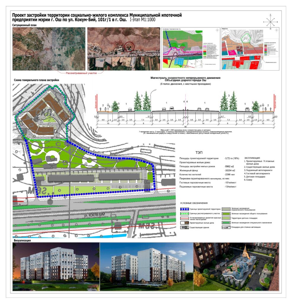 Рассматриваемая территория расположена в западной части города Ош по ул. Кокум-Бий, 100г/1, у подножия горы Керме-Тоо. Согласно утверждённому Генеральному плану города Ош (Постановление Правительства КР №160 от 29.03.2016 г.) участок относится к территориям зелёных насаждений специального назначения и находится в границах буферной зоны объекта Всемирного наследия «Сулайман-Тоо». Проектом предлагается строительство 9-этажных многоквартирных жилых домов в рамках реализации программы Муниципального ипотечного предприятия мэрии города Ош. Общая площадь жилищного фонда составляет 30 204 м², расчётная численность населения — 2 298 человек. Предусмотрены подземные и гостевые парковочные места, благоустройство территории, детские площадки и элементы озеленения.