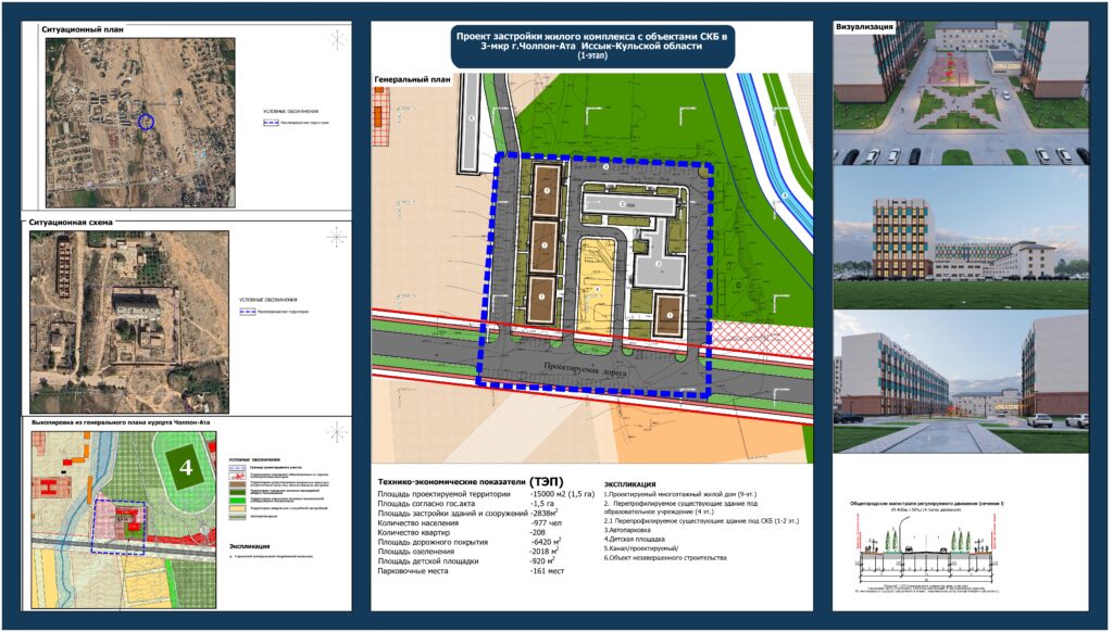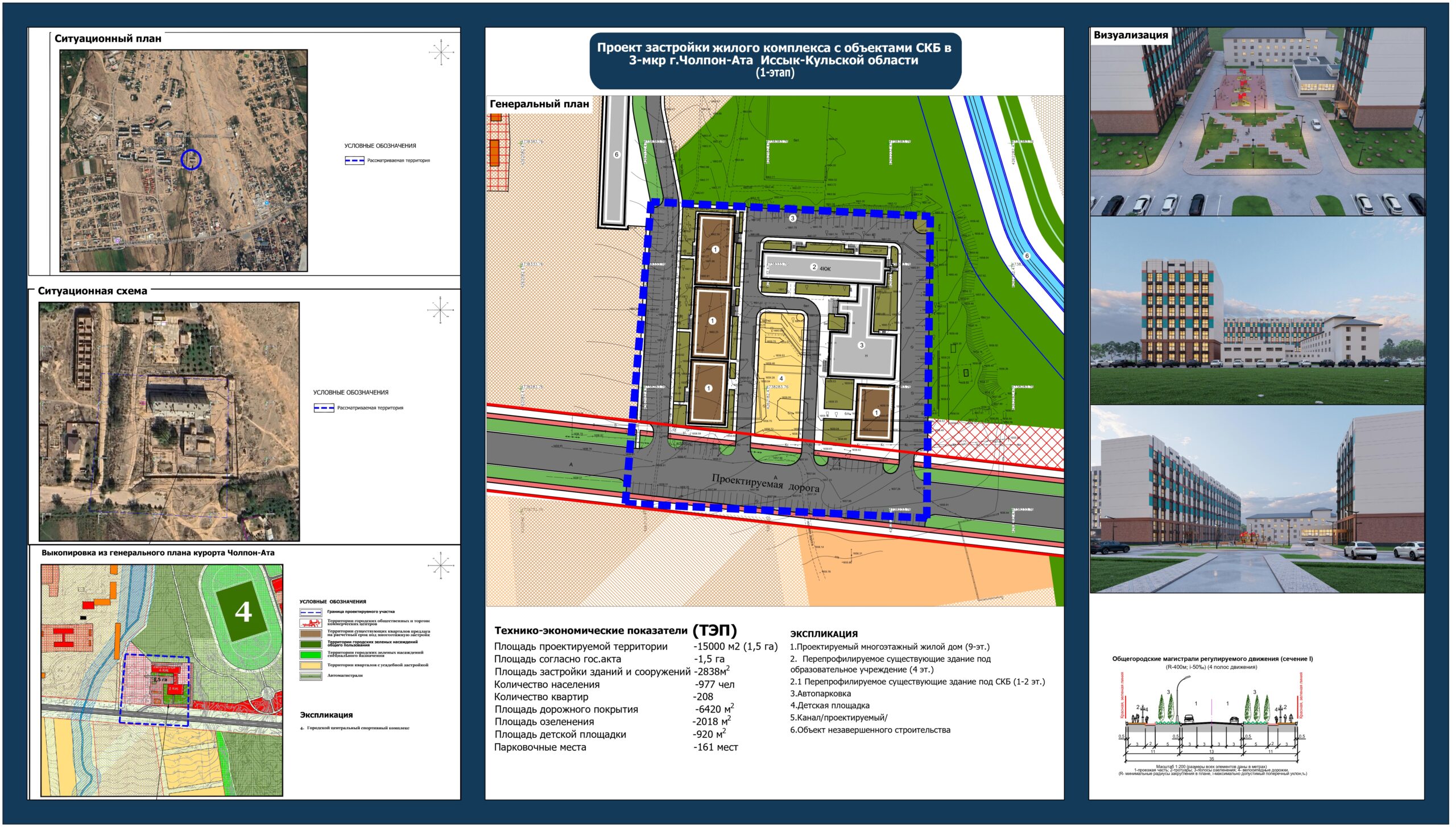 Проект застройки жилого комплекса с объектами СКБ в 3-мкр г.Чолпон-Ата Иссык-Кульской области, разработан Департаментом, базируются на градостроительной оценке сложившейся планировки и застройки проектируемой территории и исходят из актуализированных и детализированных проектных решений и расчетных данных по комплексной модернизации застройки, на основании утверждённого “Генерального плана курортного комплекса города Чолпон-Ата от 4 апреля 2007 года №91″. Рассматриваемый земельный участок, согласно генеральному плану курорта города Чолпон-Ата, расположен в зоне « Территории городских общественных и торгово-коммерческих центров».