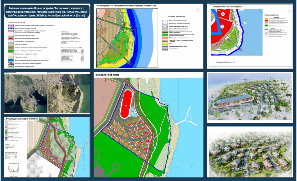 Внесение изменений в проект застройки «Гостиничного комплекса с малоэтажными строениями гостевого назначения» в г. Чолпон-Ата, район Ала-Тоо, южная сторона ЦО Кейсар Иссык-Кульской области. (2 очередь строительства) разработан Департаментом, который базируются на градостроительной оценке сложившейся планировки и застройки проектируемой территории и исходят из актуализированных и детализированных проектных решений и расчетных данных по комплексной модернизации застройки, на основании утверждённого “Генерального плана курортного комплекса города Чолпон-Ата от 4 апреля 2007 года №91″.